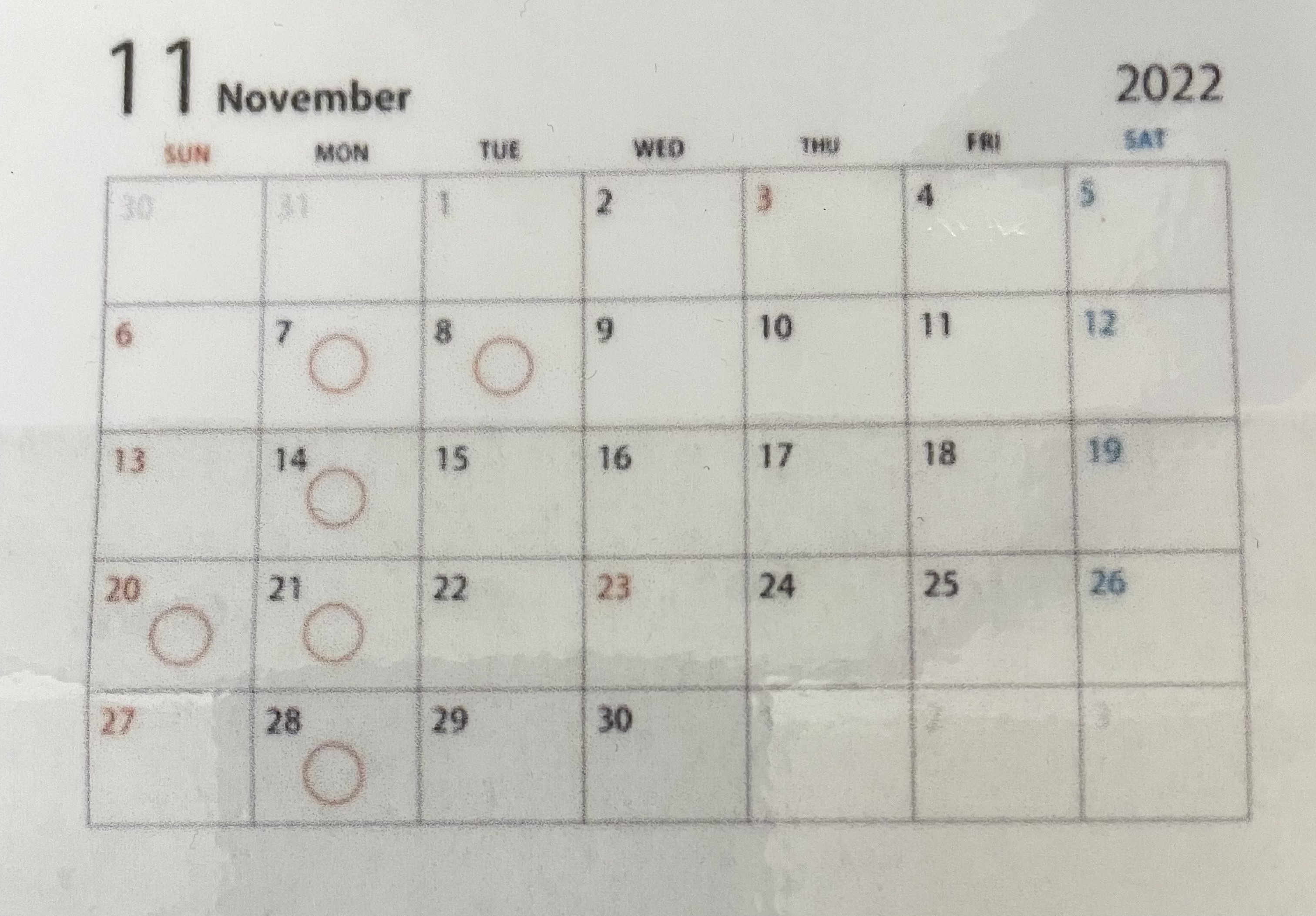 11月の定休日のお知らせ 2022-11-02 (水) 本日もご来店ありがとうございます。 11月です。 だいぶ寒くなってきましたが みなさまお体に気をつけて お過ごしくださいませ😷 11月の定休日のご案内です TEL 0120-60-0231 永井